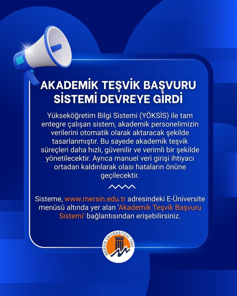 Üniversitemiz Akademik Teşvik Düzenleme, Denetleme ve İtiraz Komisyonu tarafından 2025 yılı akademik teşvik başvuruları değerlendirilmiş; kesin sonuçları Üniversitemiz Akademik Teşvik Başvuru Sistemi modülünden erişime açılmıştır. Akademik Teşvik