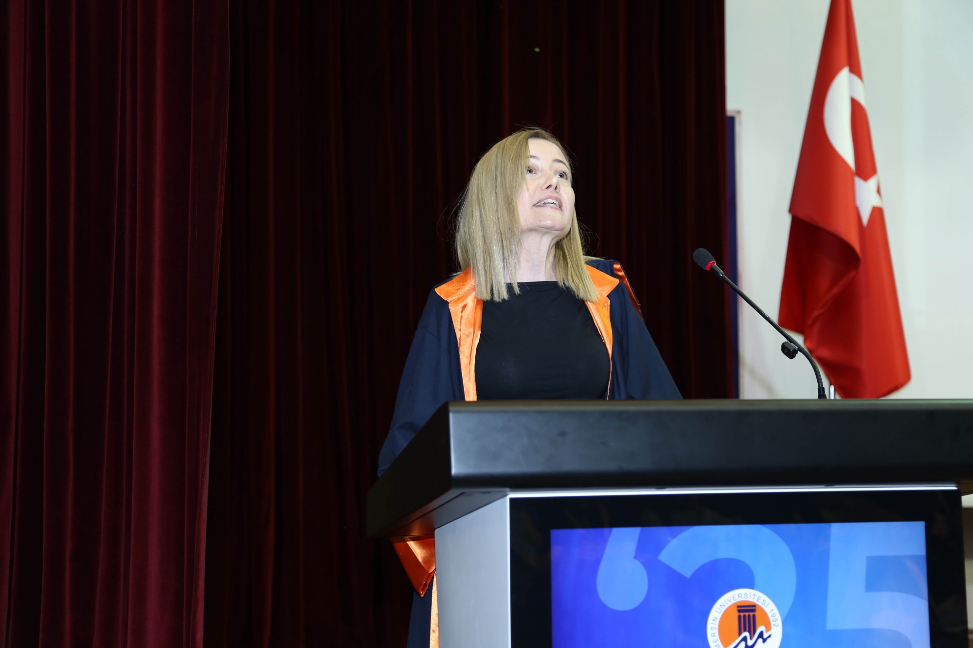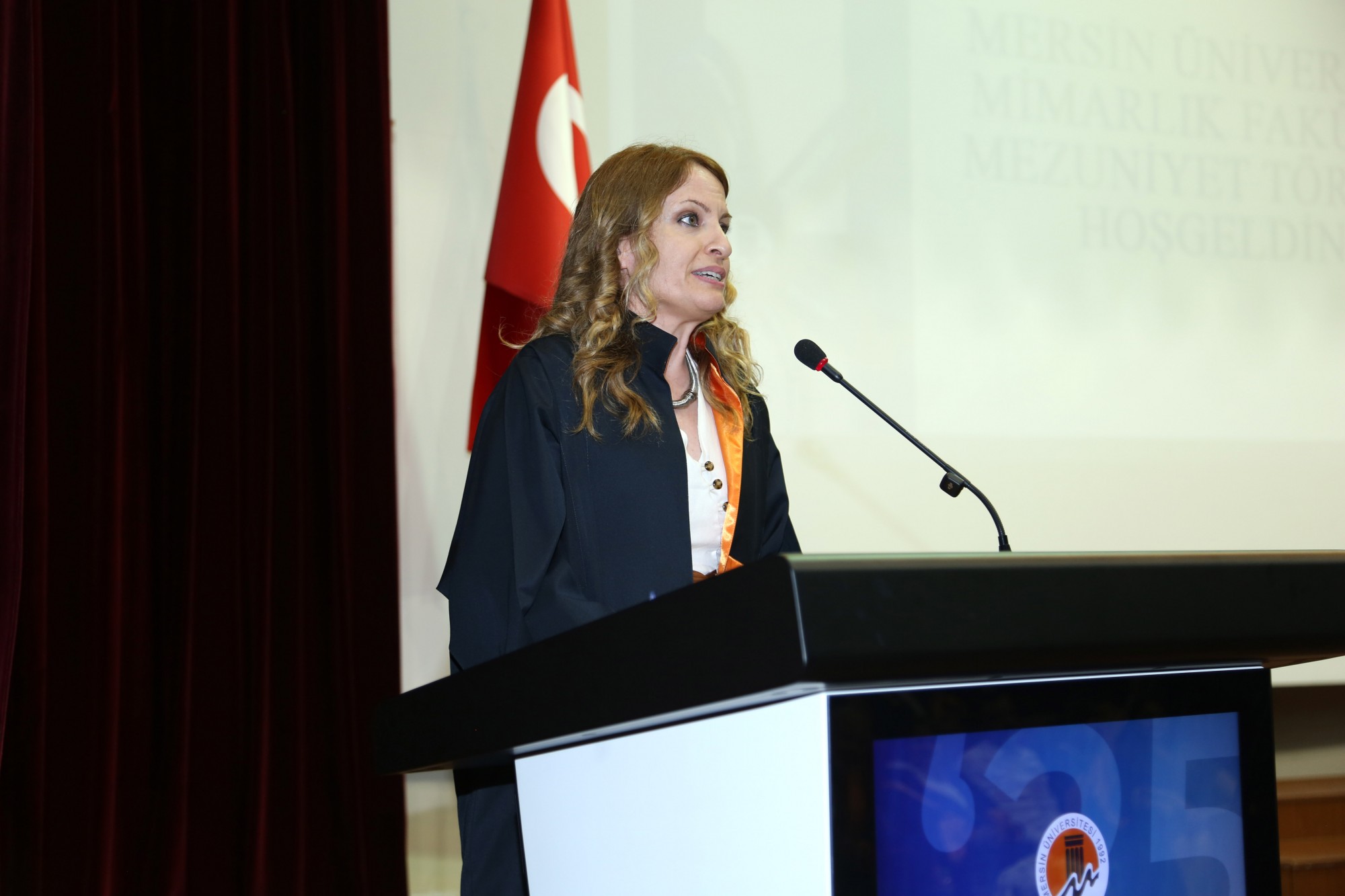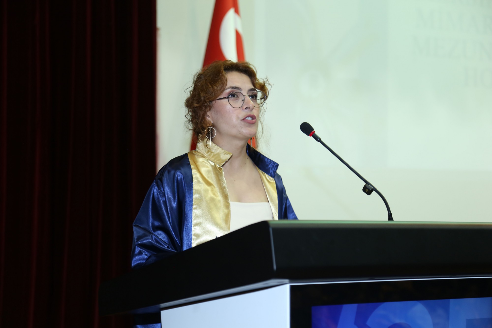 Mimarlık Fakültesi Dekanımız Prof. Dr. Nida Naycı yaptığı konuşmada, zorlu bir eğitim sürecini tamamlayan öğrencileri ve onları yalnız bırakmayan aileleri içtenlikle kutladı. Mimarlık eğitiminin yalnızca teknik beceri değil, aynı zamanda sorgulayıcı düşünme, yaratıcılık ve sorumluluk duygusu gerektirdiğini vurgulayan Prof. Dr. Naycı, “Sizler akademik başarınızın yanında ulusal yarışmalarda gösterdiğiniz performansla da gurur kaynağı oldunuz.” dedi. Depremler ve afetlerle birlikte gündeme gelen mesleki sorumluluklara da değinen Prof. Dr. Nida Naycı, bilimden, teknikten ve meslek etiğinden uzaklaşıldığında küçük ihmallerin büyük felaketlere dönüştüğünü belirterek mezunlarımızı aklın ve bilimin yolundan ayrılmamaları konusunda uyardı.