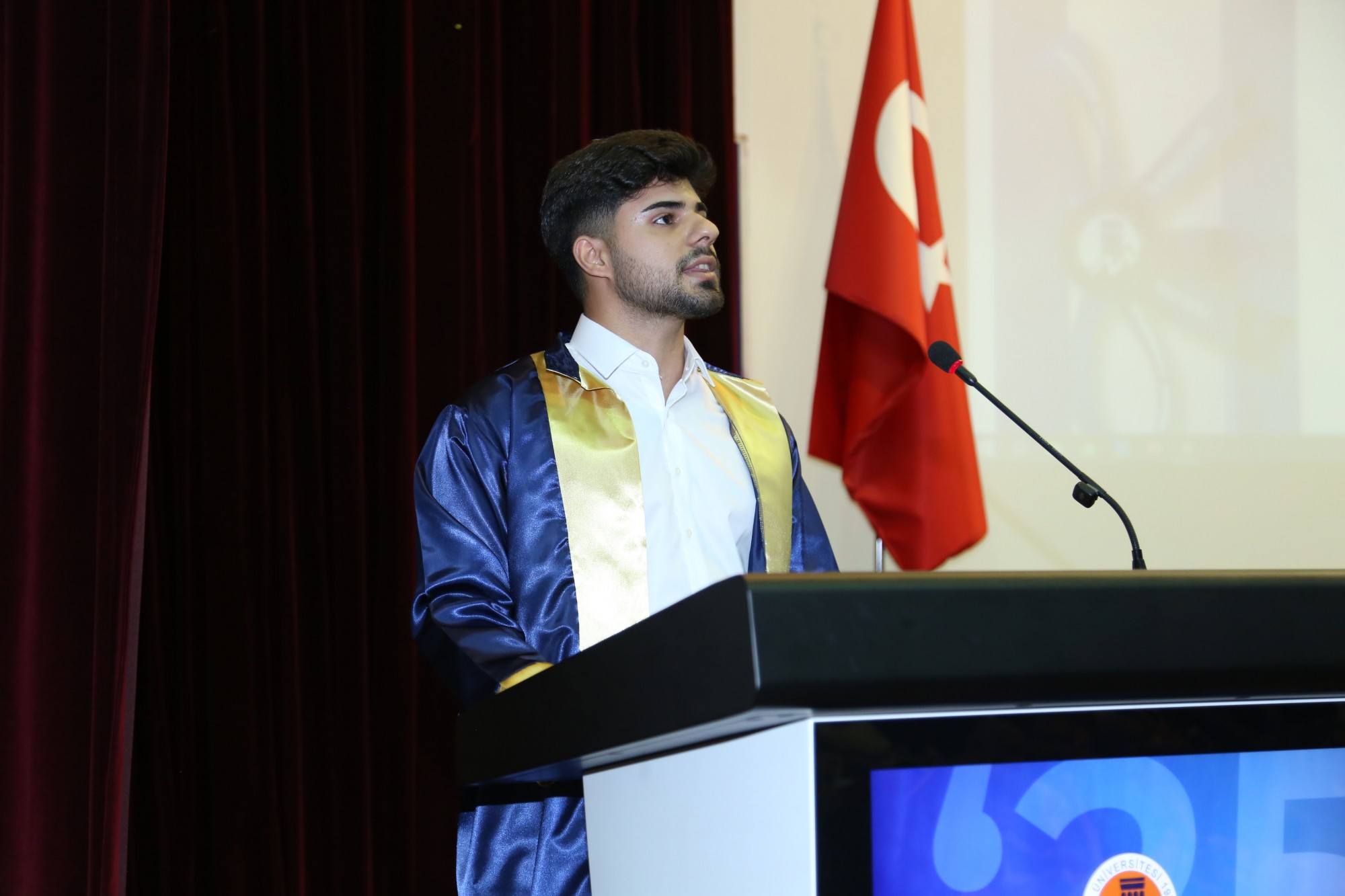 Mimarlık Bölümü öğrenci temsilcisi Umut Tezcan, mezuniyetin yalnızca bir bitiş değil, sorumlulukla hayata karışma anı olduğunu vurguladığı konuşmasında “Mimarlık sadece binalar inşa etmek değildir. Aynı zamanda bir ülkenin belleğini, kültürünü ve geleceğini inşa etmektir. Kalemle çizdiğimiz her çizgi bir yaşam, bir umut, bir iz bırakır bu dünyada. Bu ülkeye yaraşır mimarlar olmak dileğiyle; adil, vicdanlı, duyarlı, sorumlu bir geleceği birlikte inşa edelim,” ifadelerini kullandı.