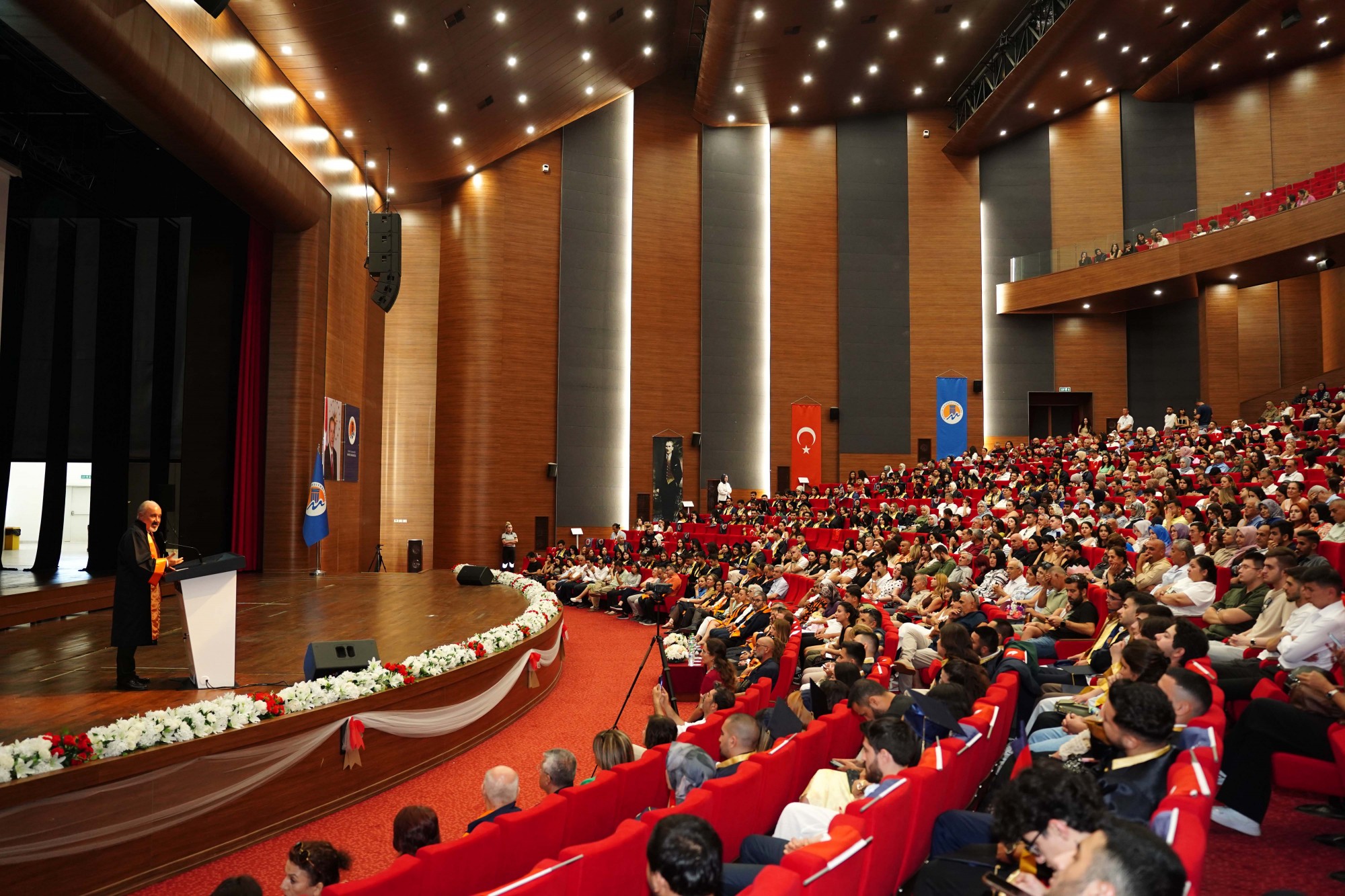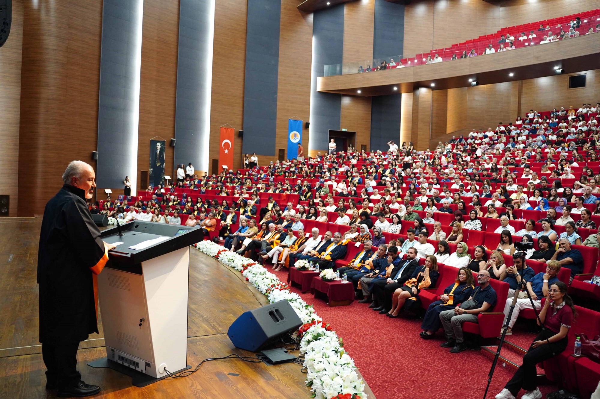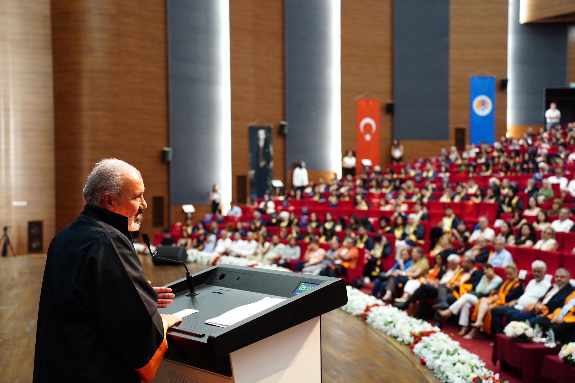 Konuşmasına öğrencilerimizin eğitim hayatlarında maddi ve manevi her zaman yanlarında olan velilere teşekkür ederek başlayan Rektör Yardımcımız Prof. Dr. Mehmet İsmail Yağcı, “Öncelikle değerli velilerimize gönülden bir teşekkür sunmak istiyorum. Çünkü bu gençlerin yetişmesinde hem maddi hem manevi büyük fedakârlıklar yapan, her şeylerini çocuklarına adayan anne ve babalar sizlersiniz. Aynı şekilde, akademik donanımlarıyla, davranış biçimleriyle birer rol model olan ve mezunlarımıza bilgilerini büyük bir emekle aktaran kıymetli akademisyen arkadaşlarımızı da tebrik ediyorum. Bu fakültenin işleyişinde görünmez kahramanlar da var. Sizler de dört yıl boyunca şahit oldunuz; fakültemizin düzgün ve fonksiyonel bir şekilde işlemesi için geceli gündüzlü çalışan idari personelimiz de en az akademik kadro kadar alkışı hak ediyor. 2024–2025 akademik yılı içerisinde kaybettiğimiz çok kıymetli hocamız Prof. Dr. Yasemin Özuğurlu’yu da rahmetle anmak istiyorum. Keşke bugün aramızda olsaydı. Mezuniyet sevincinizde onun da büyük emeği, katkısı vardı. Allah rahmet eylesin. Eminim ki şu an bir yerlerden sizlerin başarısını gururla izliyordur.” dedi.