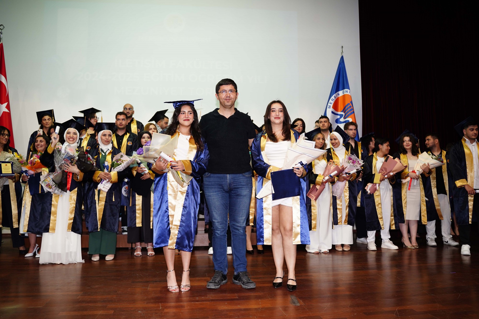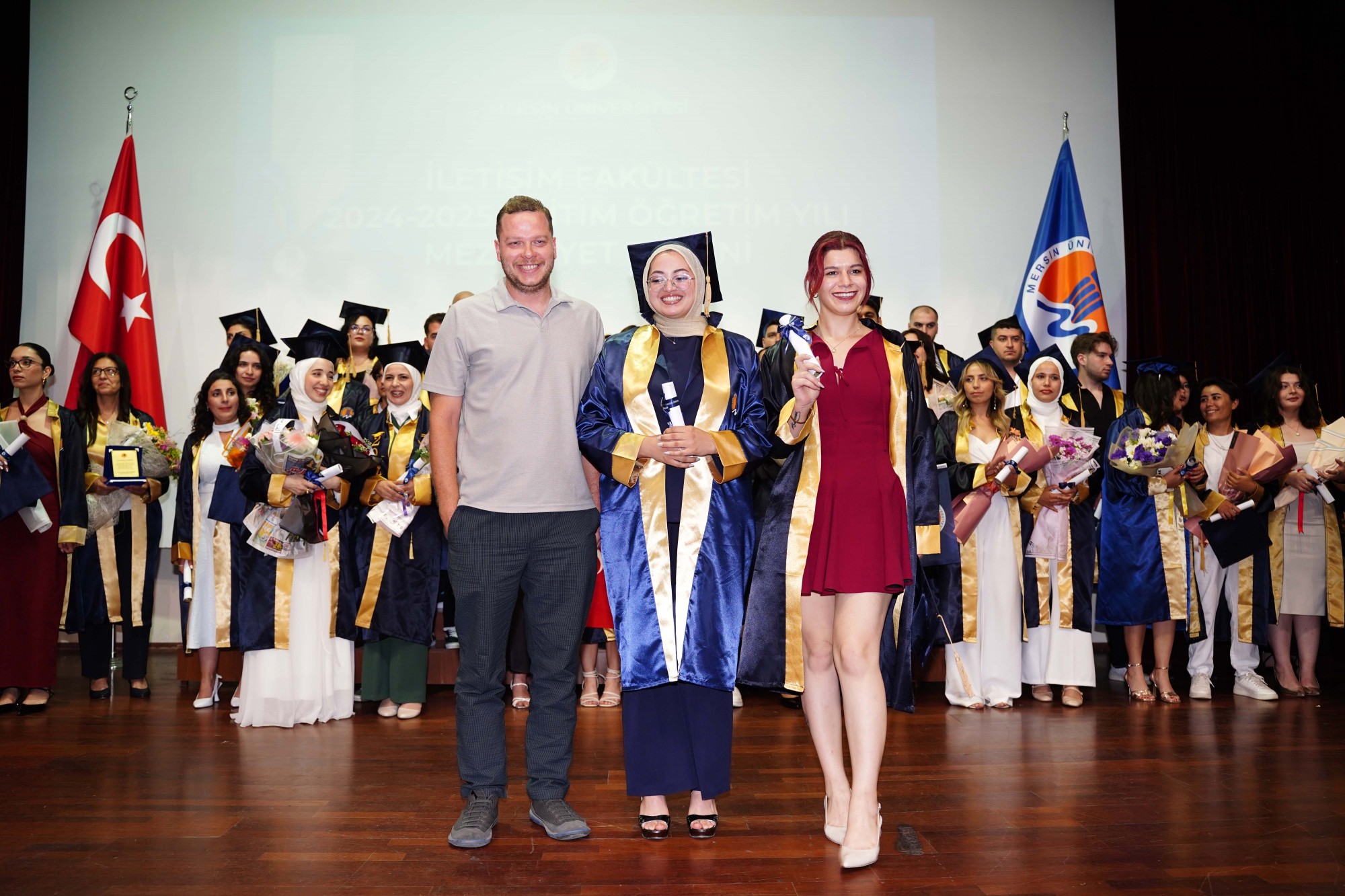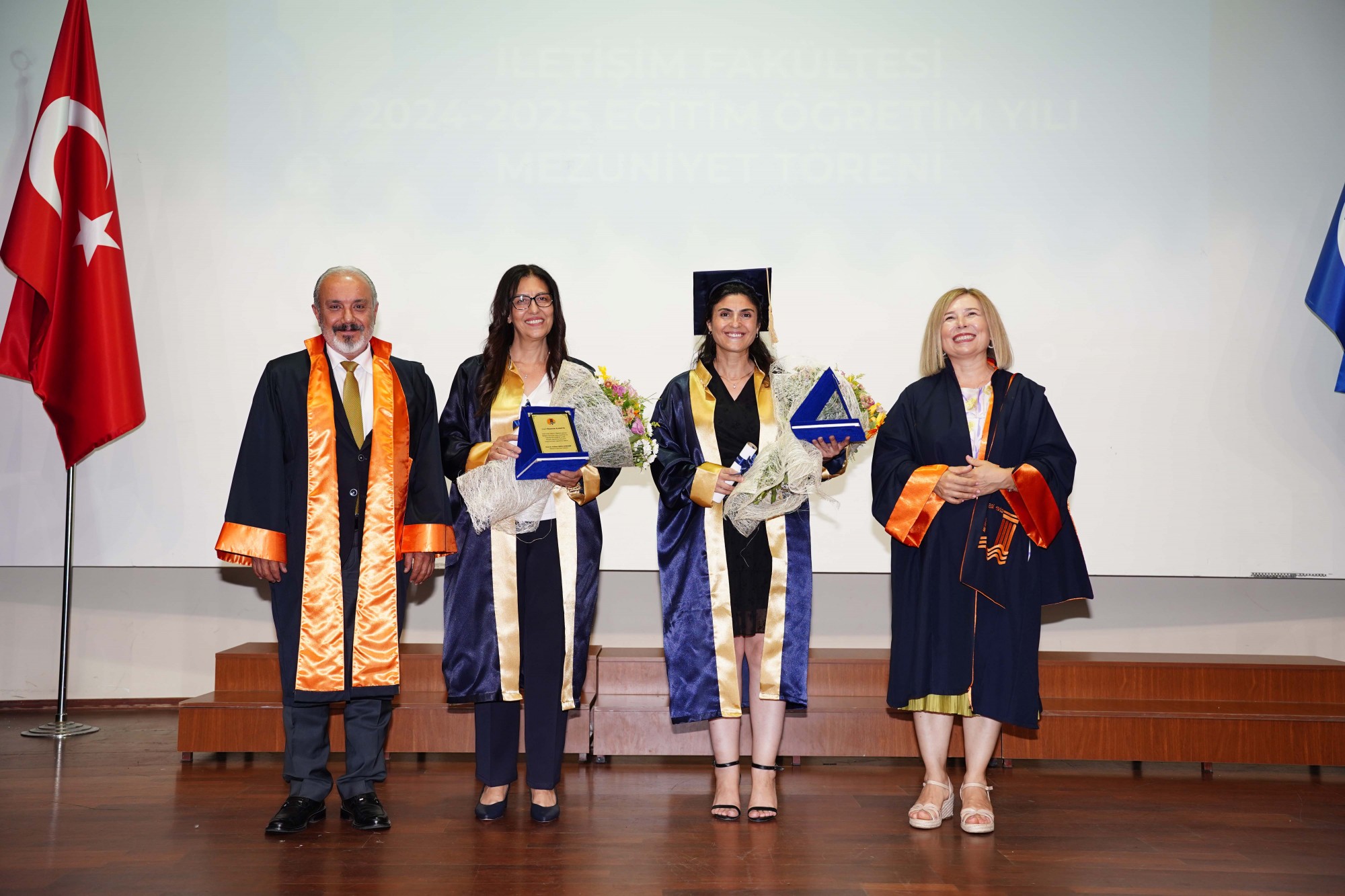 Ardından Fakülte Birincisi Musavver Alageyik ve Fakülte İkincisi Ceyhan Amat Atınç’a Rektör Yardımcımız Prof. Dr. Mehmet İsmail Yağcı ile İletişim Fakültesi Dekanımız Prof. Dr. Aslıhan Ardıç Çobaner tarafından plaket, çiçek ve temsili diplomaları takdim edildi.