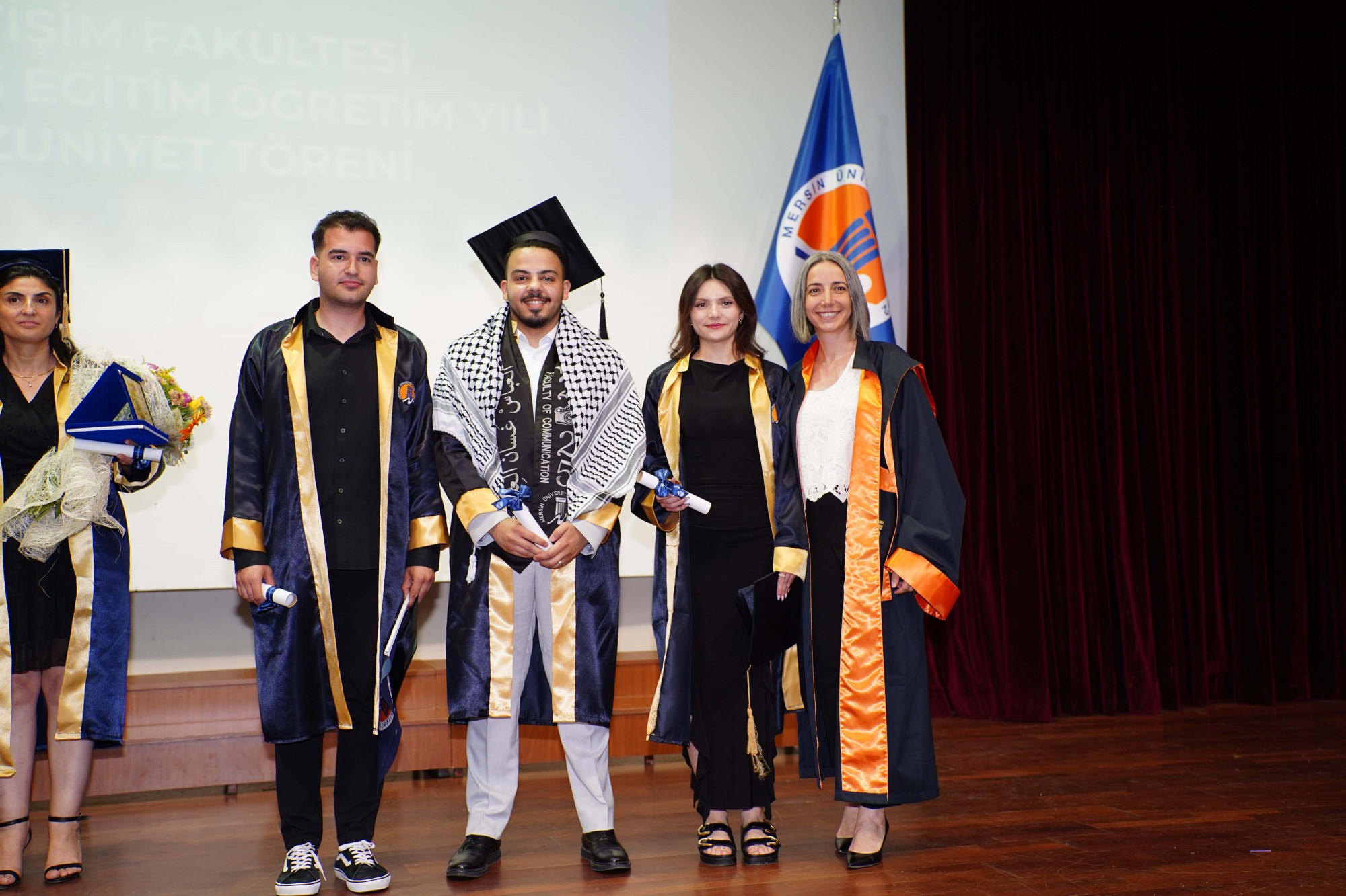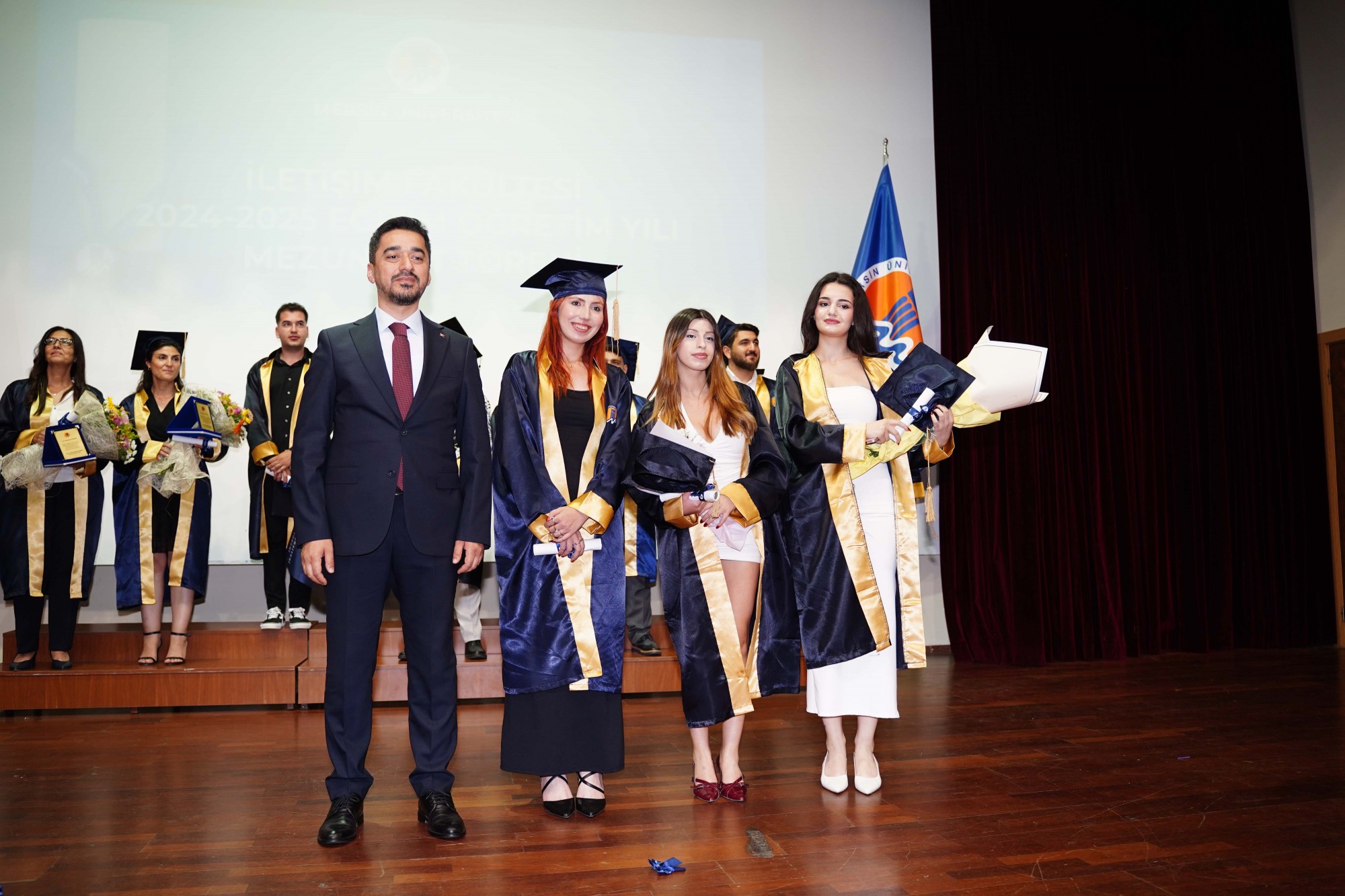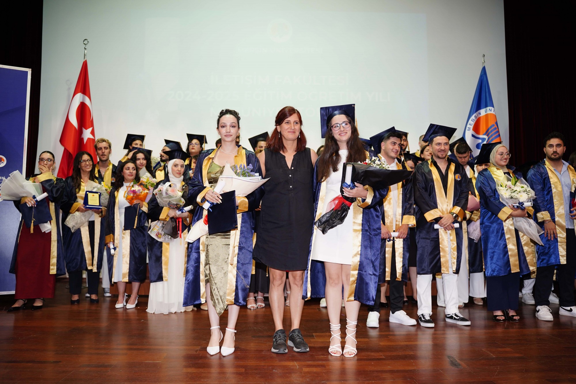 Ardından Fakülte Birincisi Musavver Alageyik ve Fakülte İkincisi Ceyhan Amat Atınç’a Rektör Yardımcımız Prof. Dr. Mehmet İsmail Yağcı ile İletişim Fakültesi Dekanımız Prof. Dr. Aslıhan Ardıç Çobaner tarafından plaket, çiçek ve temsili diplomaları takdim edildi.