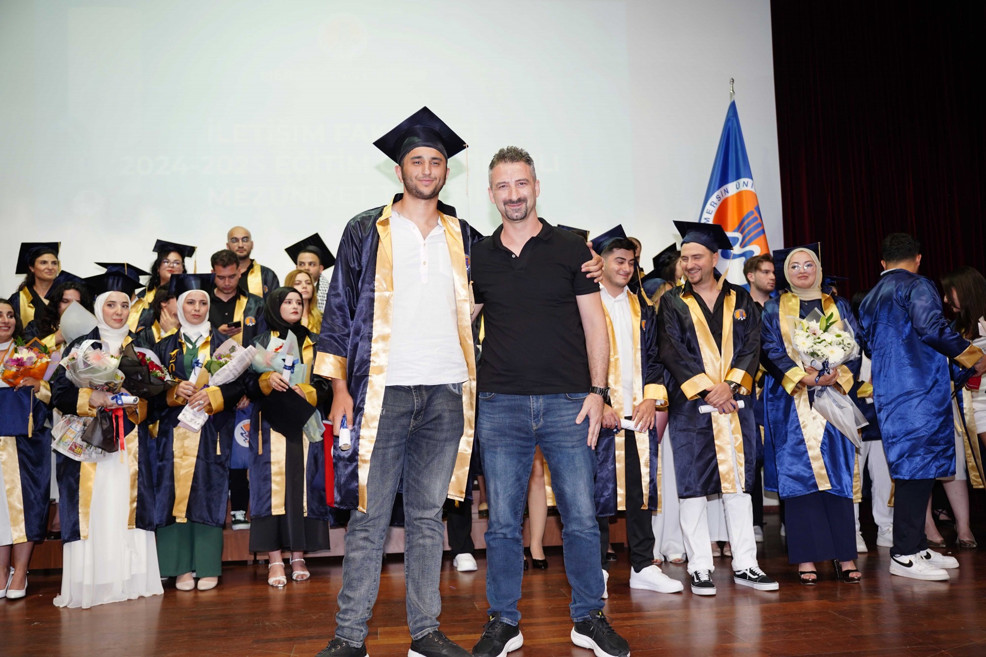Mezun öğrencileri temsilen konuşma yapan Devrim Bükrücü, “Bu yolun en başından itibaren bizlere emek veren, bilgi ve deneyimlerini paylaşan çok kıymetli hocalarımıza en içten teşekkürlerimi sunuyorum. Her zaman yol gösterici, yapıcı ve sabırlı oldunuz. Bugün buradaysak, bunda sizlerin emeği çok. Bizlere sadece doğruların kendisini değil, doğruyu nasıl arayacağımızı da öğrettiniz. Ve bu süreçte arkamızda siz olduğunuz için hata yapmanın da bu işin önemli bir parçası olduğunu öğrendik. Çünkü bu sektörde olacaksak neyi yapacağımızı öğrenmek çok önemli ama neyi yapmayacağımızı öğrenmek daha da önemli. Hatalarımızın telafisinde de her zaman arkamızda olduğunuz için sizlere yeniden teşekkür ediyorum. Hayatımız boyunca hep arkamızda duran ve çoğumuzun en büyük yapım sponsorları ailelerimize gönülden bir teşekkür etmek istiyorum. Bize her zaman inandınız. Yorulsak da yılsak da siz hep aynı yerden, aynı güvenle baktınız bize. Bizi olduğumuz gibi sevdiniz, her hâlimize razı oldunuz. Kimi zaman sadece “Ben buradayım” demeniz bile bizim için her şeyi kolaylaştırdı. Şimdi biz burada mezun oluyoruz, ama bu başarıda sizin emeğiniz, sabrınız ve dualarınız var. Bu kürsüde dururken bilmenizi isterim ki; sizin desteğiniz olmasaydı, bugün bu cüppelerin içinde bu kadar dik duramazdık. Bugün burada, birer iletişimci olarak mezun olurken, sadece mesleki bilgiyle değil; Cumhuriyet’in temel ilkeleri olan akıl, bilim, eşitlik ve özgürlükle donanmış bireyler olarak hayata atılıyoruz. Ulu önder Gazi Mustafa Kemal Atatürk’ün bizlere emanet ettiği bu miras, bizlerin düşüncesine, emeğine ve yeteneğine değer veren bir geleceği mümkün kılıyor.” ifadelerini kullandı.