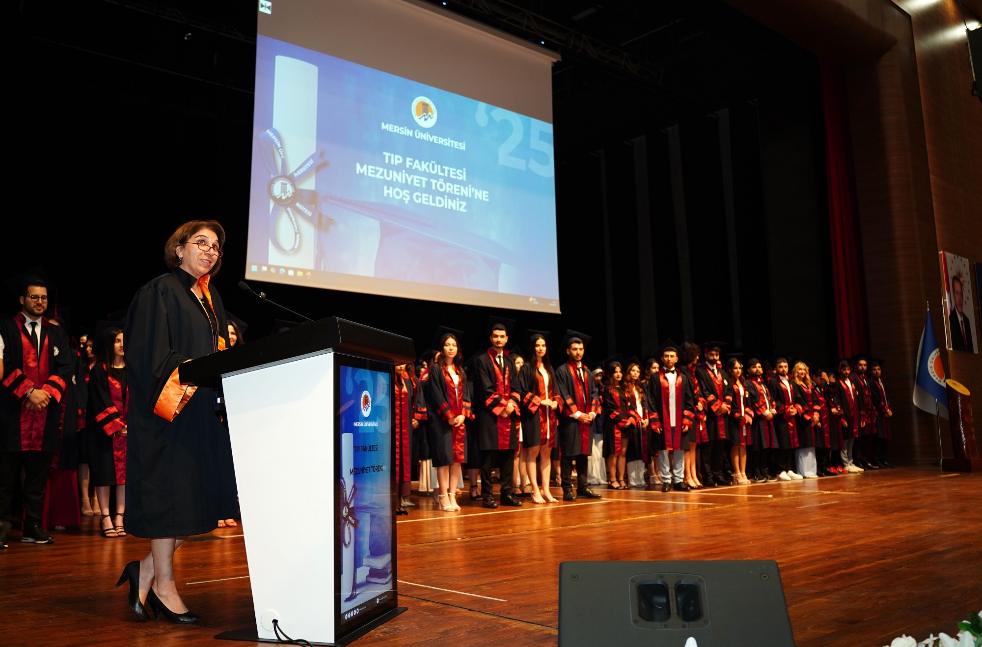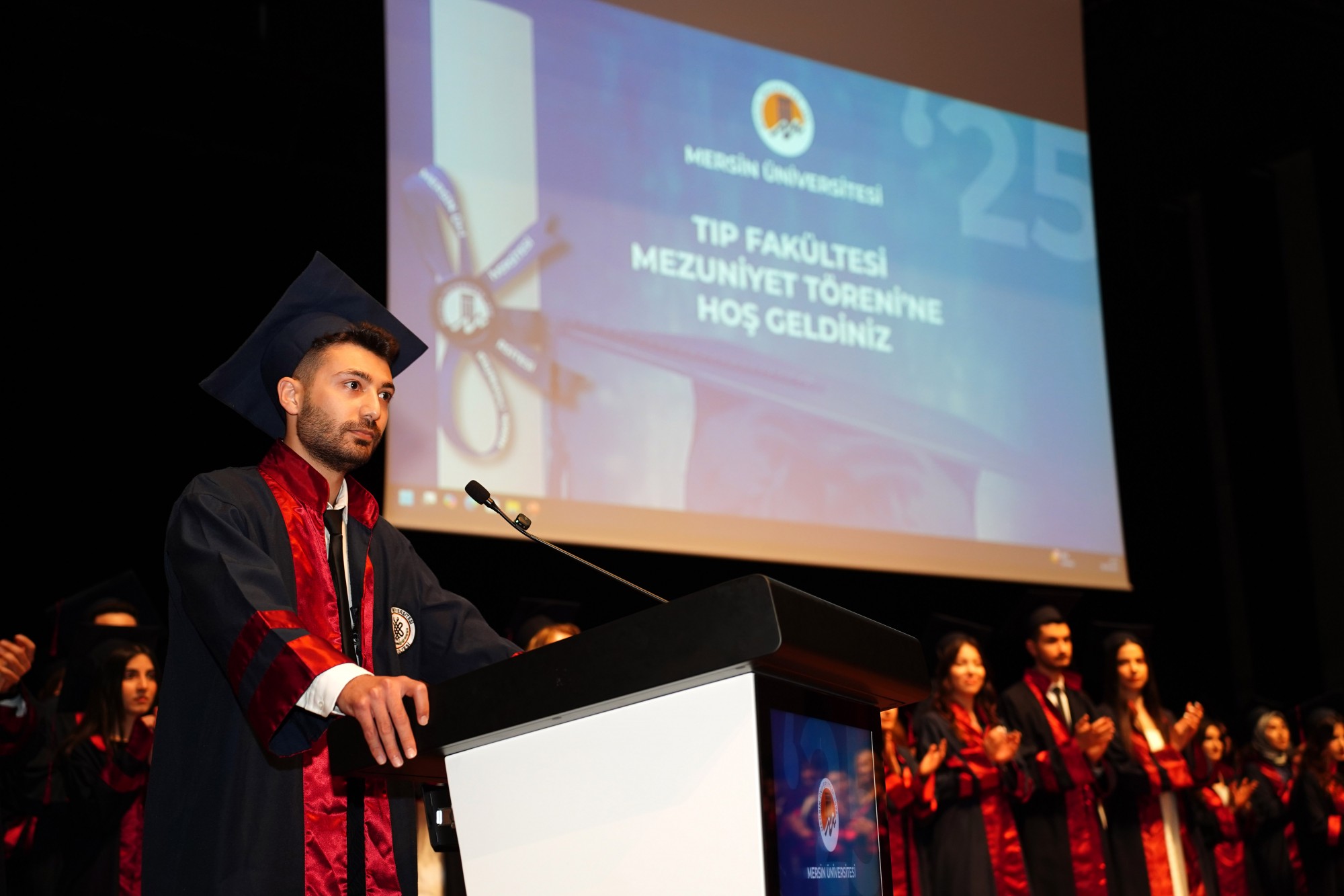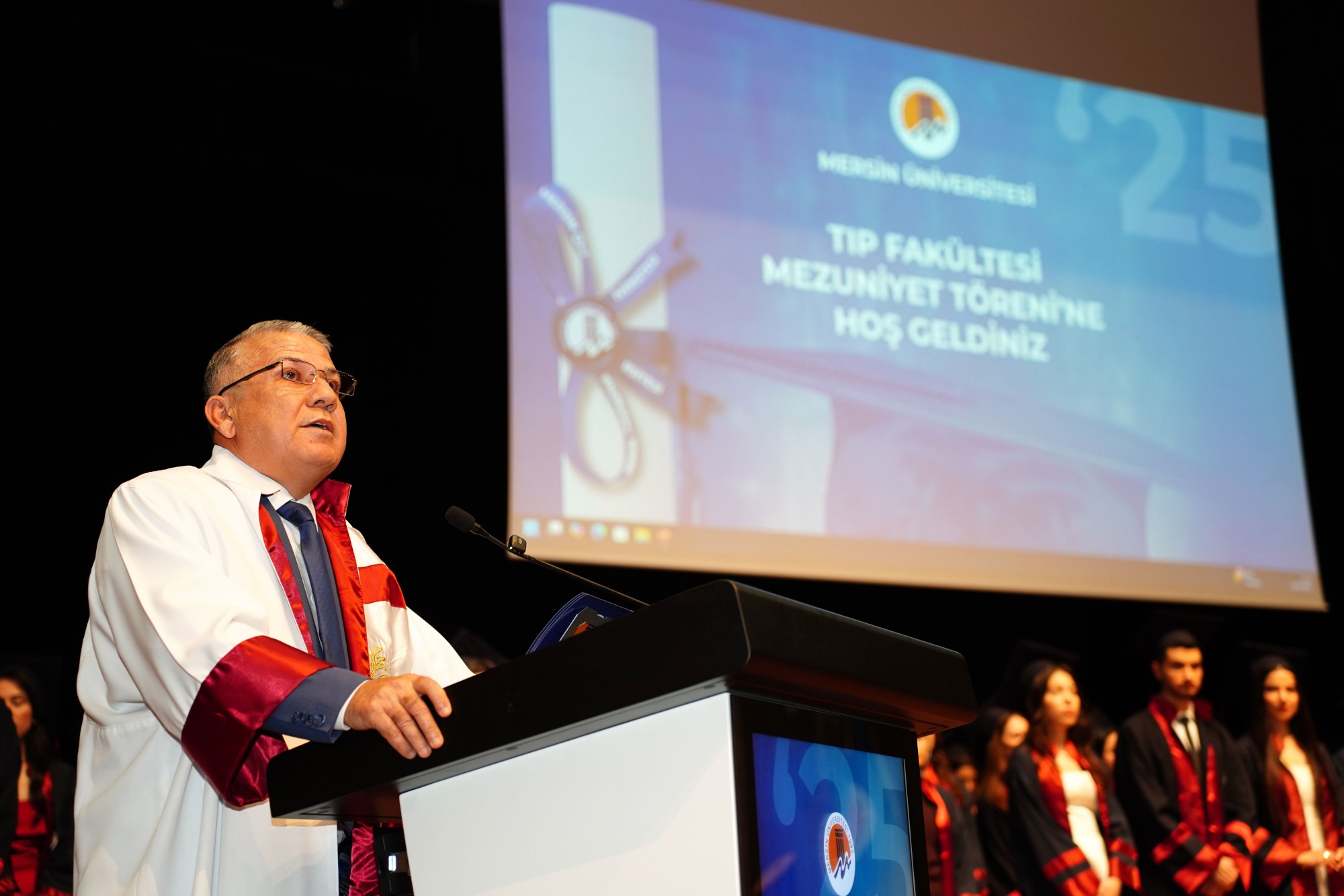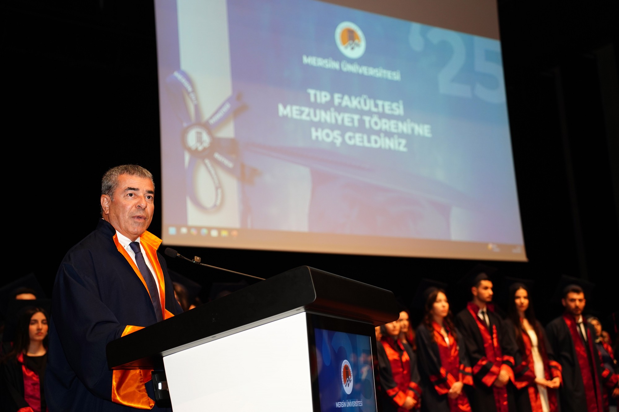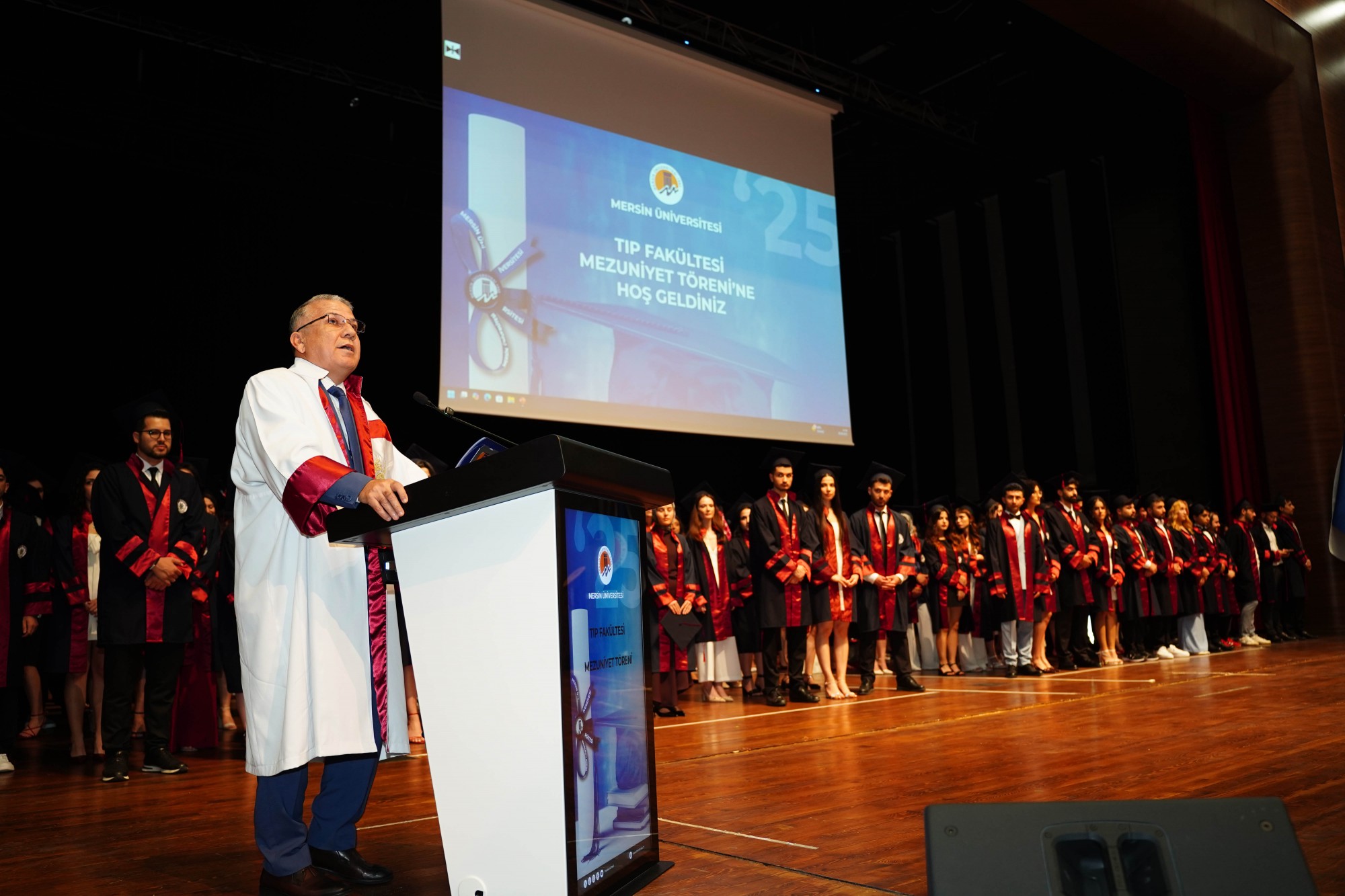 Velilerimize ve akademisyenlerimize teşekkür ettikten sonra mezunlarımıza seslenen Rektörümüz Prof. Dr. Erol Yaşar, “Bu aşamaya gelene kadar birçok zorlu yoldan geçtiniz. Bugün ise işte bu zorlu günlerin karşılığını alıyorsunuz ve Üniversitemizden birer hekim olarak mezun oluyorsunuz. Sevgili öğrencilerim, sizin ikinci yuvanız olan Mersin Üniversitesi’nin kapısı sizlere her zaman açık olacak. Mezun olmakla bizlerden ve bu yuvadan ayrılmıyorsunuz. Sevgili gençler, sizlerle gurur duyuyoruz. Sizler; yaşadığınız topluma duyarlı, araştıran, merhametli, hasta ve yakınlarıyla iyi iletişim kurabilen, etik değerleri özümsemiş nitelikli birer hekim olarak mezun oluyorsunuz. Gittiğiniz her yerde Mersin Üniversitesi’ni de temsil ettiğinizi asla unutmayın. Atatürk'ün ülkeyi muasır medeniyet seviyesinin üzerine çıkarma hedefi doğrultusunda ilerleyin. Üniversitemizin ve hekimliğin etik değerleri yolunuza ışık tutsun. Her koşulda vicdani değerleri yüksek hekimler olunuz. Yolunuz ve bahtınız açık olsun.” dedi.