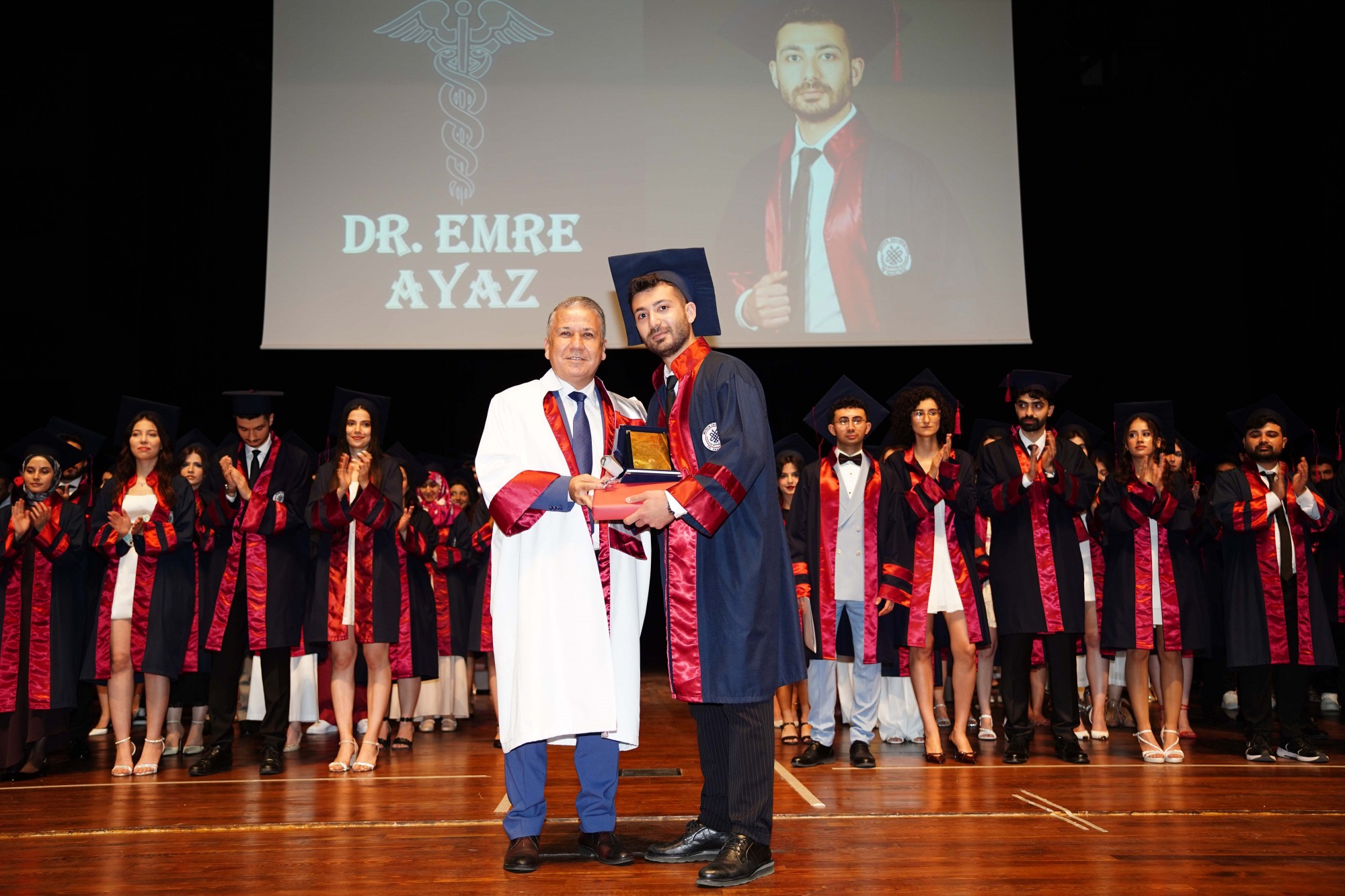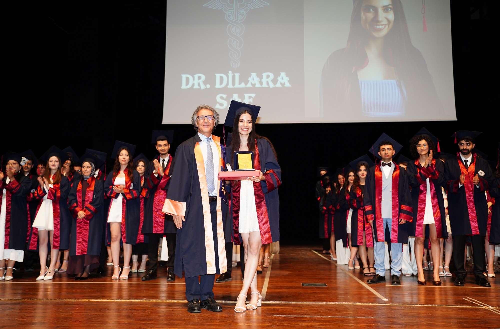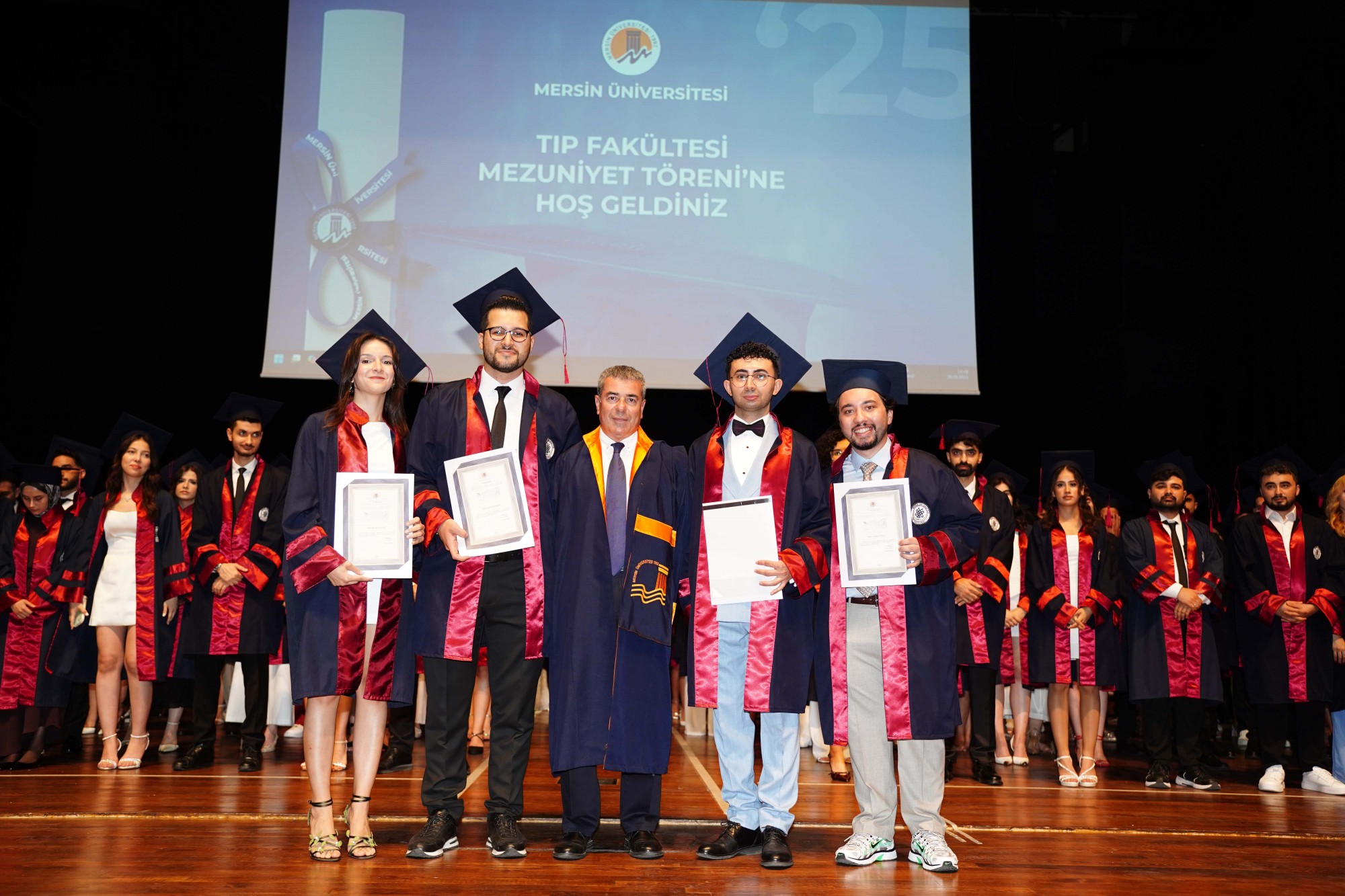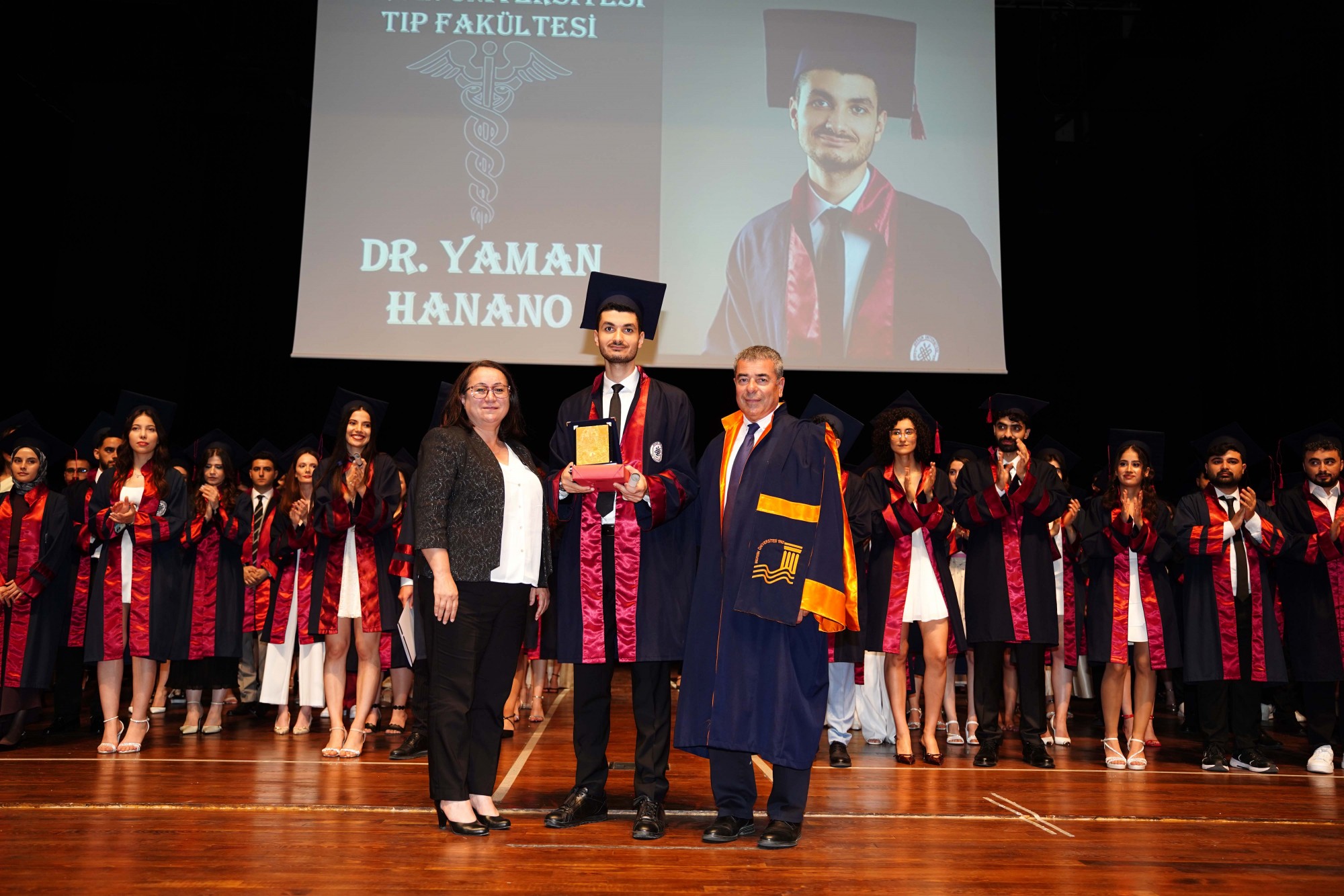 Dereceye giren mezunlarımıza plâket ve hediye takdimi ile devam eden mezuniyet töreninde dönem birincisi Dr. Emre Ayaz’a plaketini, temsili diplomasını ve hediyesini Rektörümüz Prof. Dr. Erol Yaşar takdim etti. Dönem ikincisi Dr. Dilara Saf’a Rektör Yardımcımız Prof. Dr. Ahmet Hakan Öztürk, dönem üçüncüsü Dr. Yaman Hanano’ya ise temsili diploması ve hediyesi Tıp Fakültemizin Dekanı Prof. Dr. Ali Kaya tarafından, plaketi Tabipler Odası Genel Sekreteri Uzm. Dr. Birsen Tutuş tarafından takdim edildi.