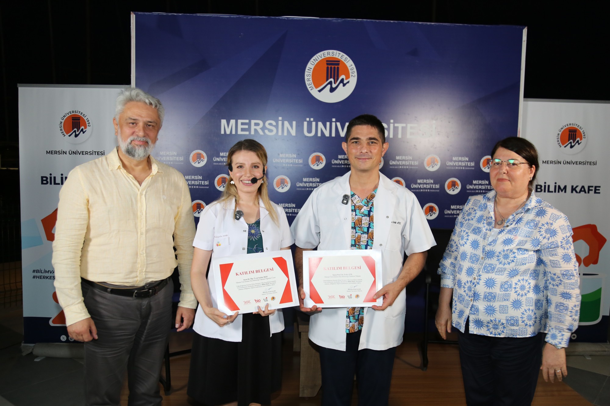 Katılımcılardan gelen sorularla interaktif bir yapıya bürünen Bilim Kafe etkinliğimizin sonunda moderatör Dr. Öğr. Üyesi Seçkin Aksu ile konuşmacı Prof. Dr. Fethi Atıl’a katılım belgeleri, Rektör Danışmanlarımız Prof. Dr. Ayla Özer ve Doç. Dr. Erhan Arslan tarafından takdim edildi.