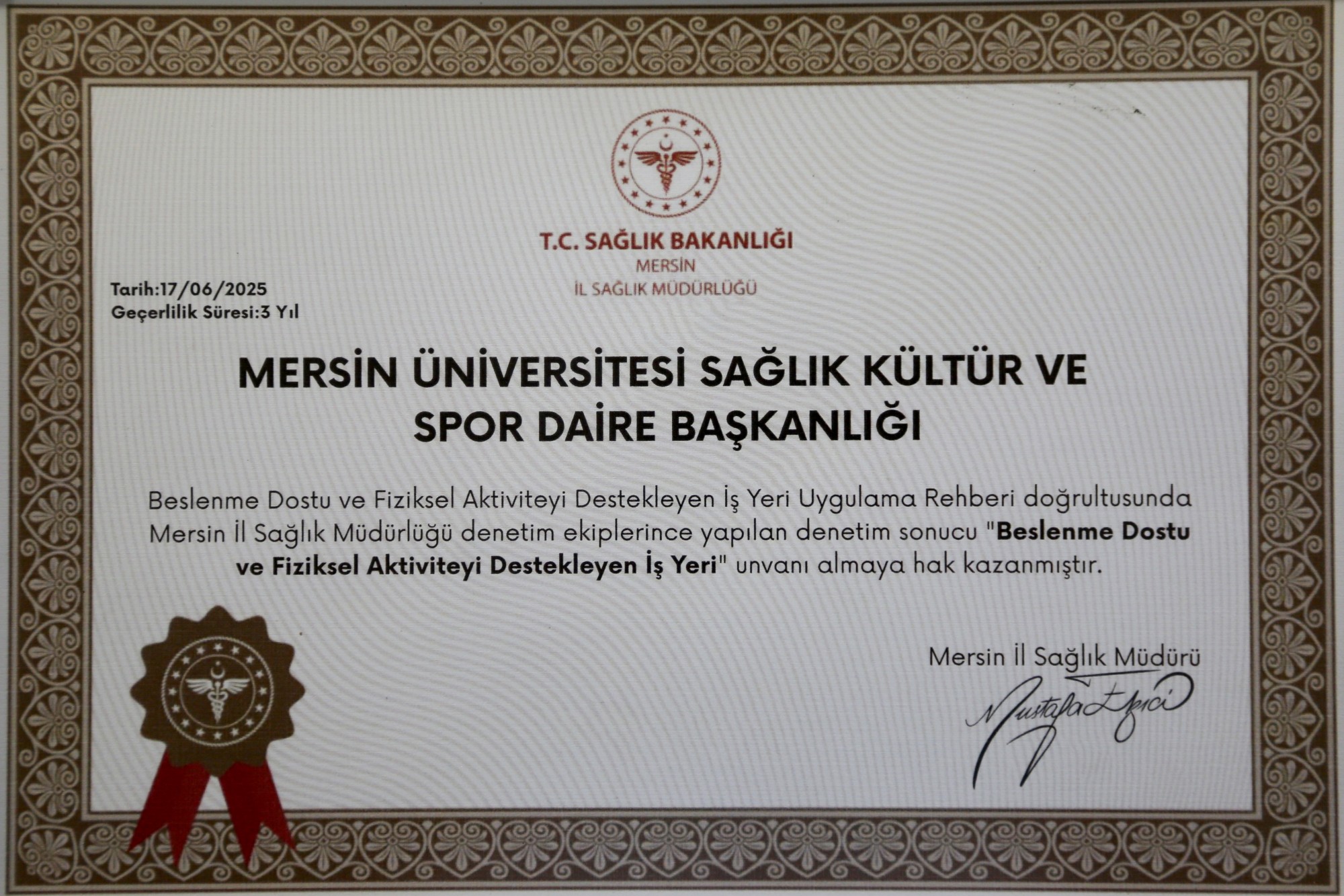 Üniversitemiz Sağlık Kültür ve Spor Daire Başkanlığı, sağlıklı yaşam ve fiziksel aktiviteyi teşvik eden çalışmalarıyla “Beslenme Dostu ve Fiziksel Aktiviteyi Destekleyen İşyeri Sertifikası” almaya hak kazandı. Daire Başkanlığımız, Türkiye genelinde yalnızca 261 kuruma verilen bu prestijli sertifikayı almaya hak kazanarak Adana ve Mersin bölgesinde bu belgeyi alan dördüncü kurum olma başarısını gösterdi.
