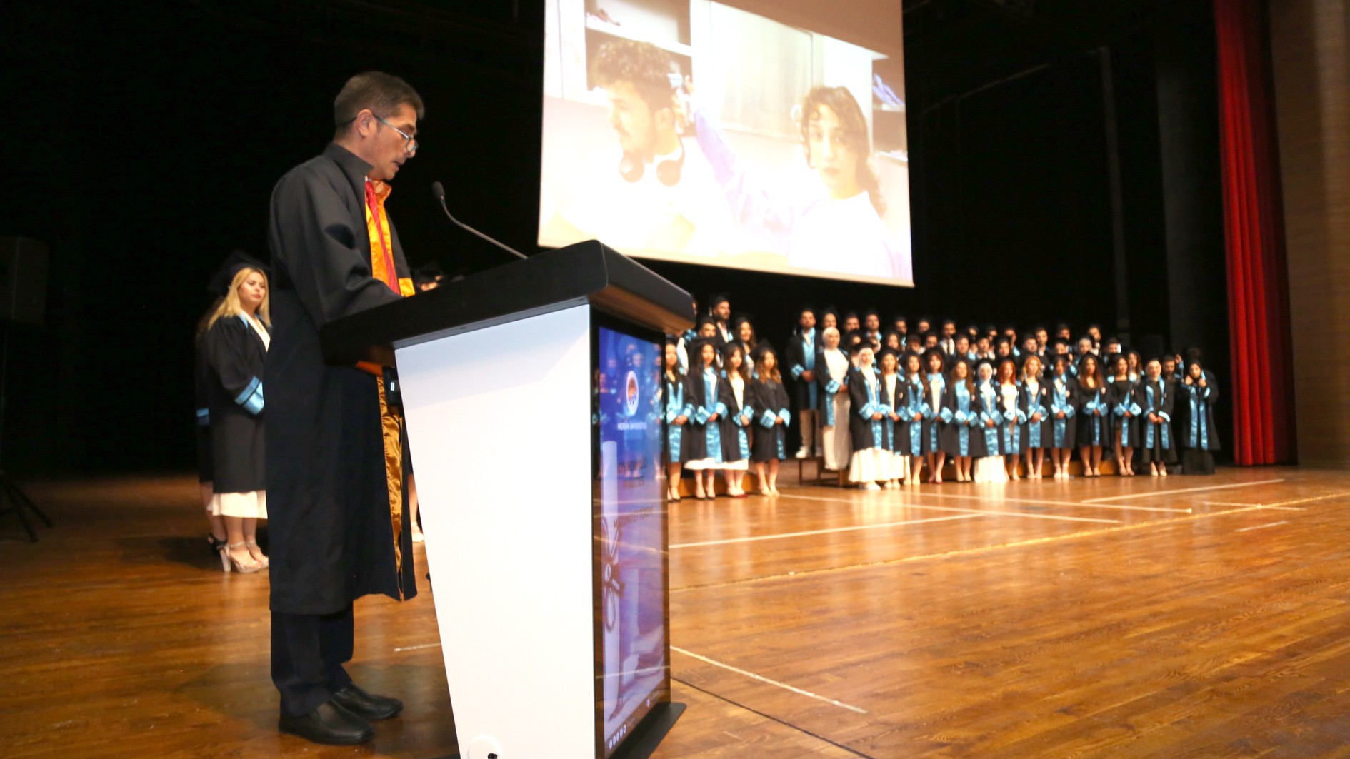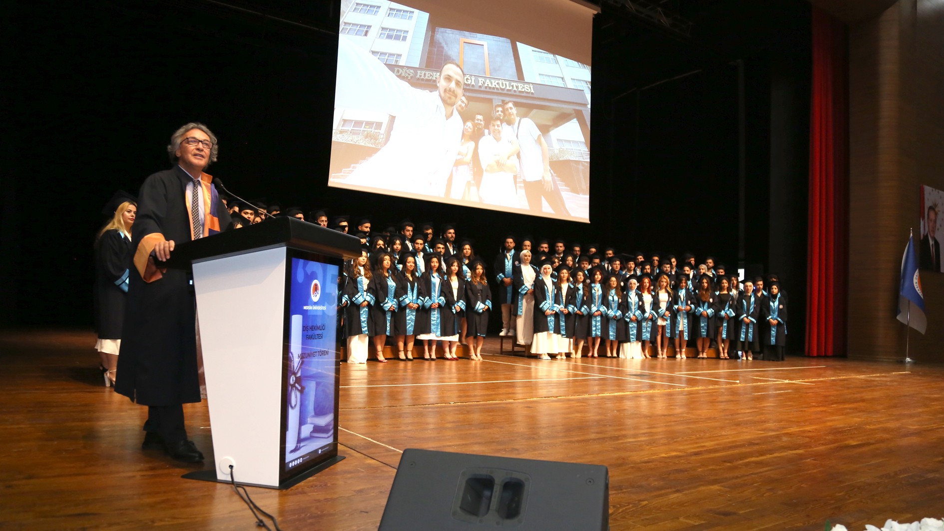Rektör Yardımcımız Prof. Dr. Ahmet Hakan Öztürk törende yaptığı konuşmada, Üniversitemizin "Bilimin ve Çağdaşlığın Işığında Bir Dünya Üniversitesi" parolasıyla eğitimde kaliteye, bilimsel üretkenliğe ve toplumsal etkiye dayalı önemli başarılara imza attığını belirtti. Prof. Dr. Öztürk, Diş Hekimliği Fakültemizin de üstün donanımlı öğrenci laboratuvarları ve son teknolojiyle donatılmış modern hastanesi sayesinde hem öğrencilere nitelikli bir eğitim sunduğunu hem de Mersin ve bölge halkına kaliteli sağlık hizmeti sağladığını ifade etti.