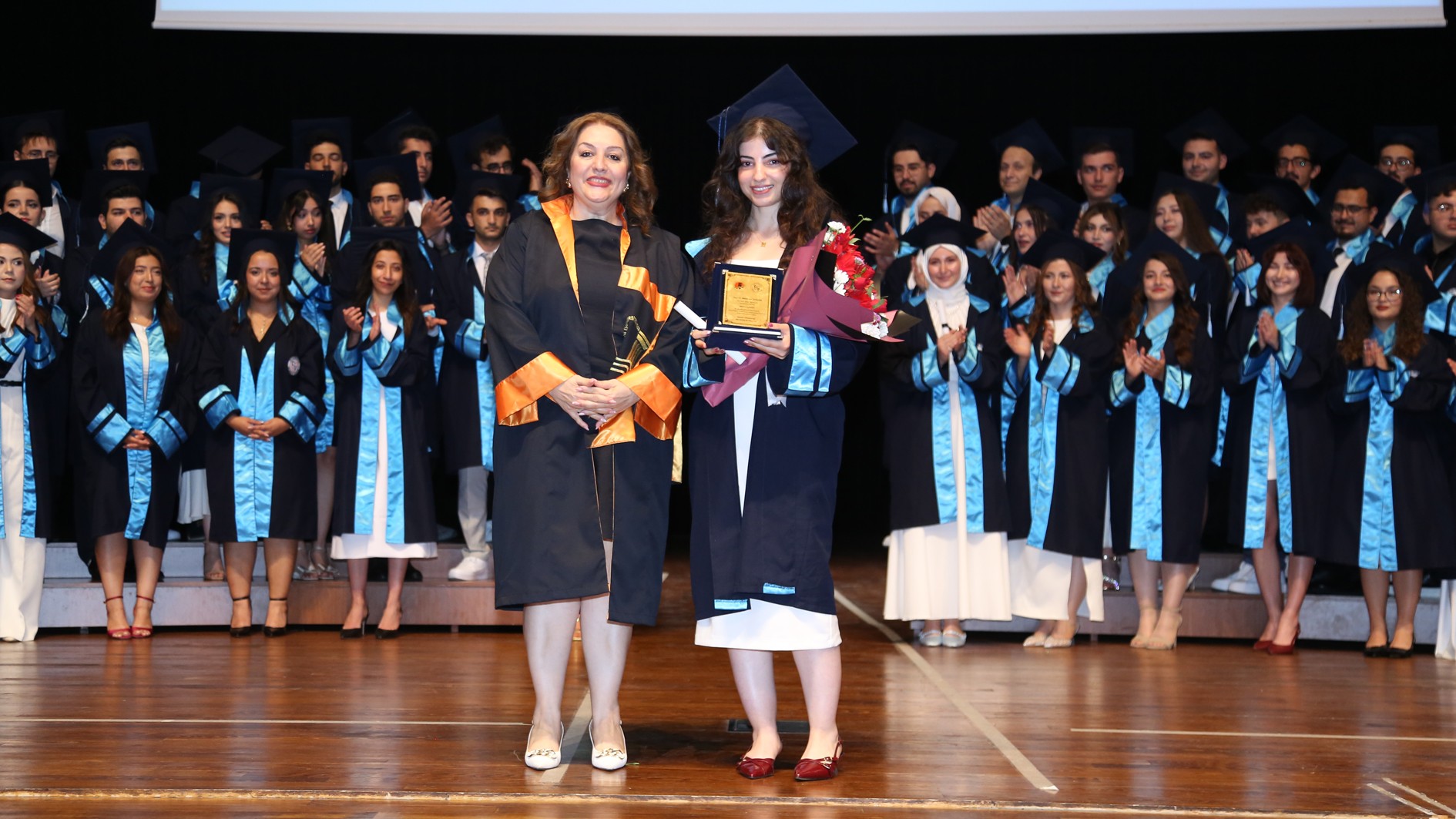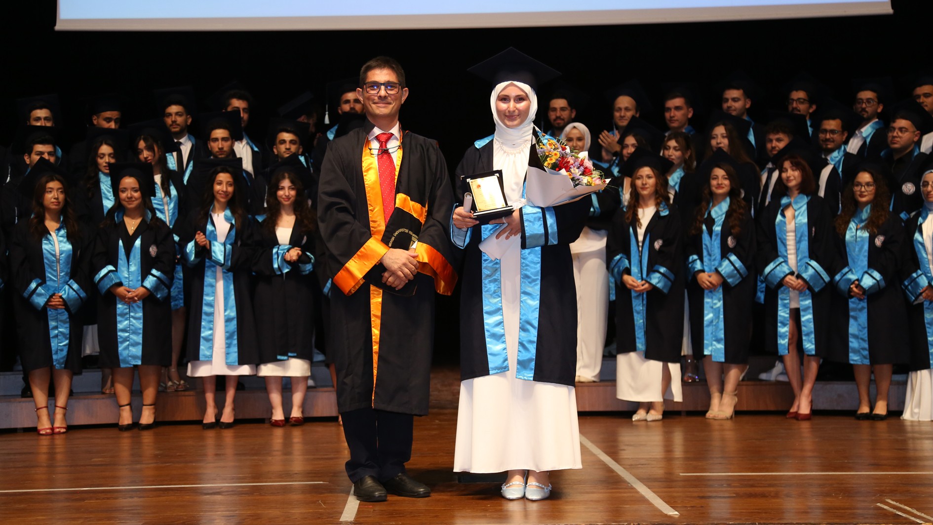 Konuşmaların ardından fakülte birincisi Diş Hekimi Azra Polat’a temsili diploması ile çiçek ve plaketi Rektör Yardımcımız Prof. Dr. Ahmet Hakan Öztürk tarafından takdim edildi. Daha sonrasında fakülte birincisi Diş Hekimi Azra Polat, mezunlar adına yaş kütüğe isim plakasını Rektör Yardımcımız Prof. Dr. Ahmet Hakan Öztürk ile birlikte çaktı.