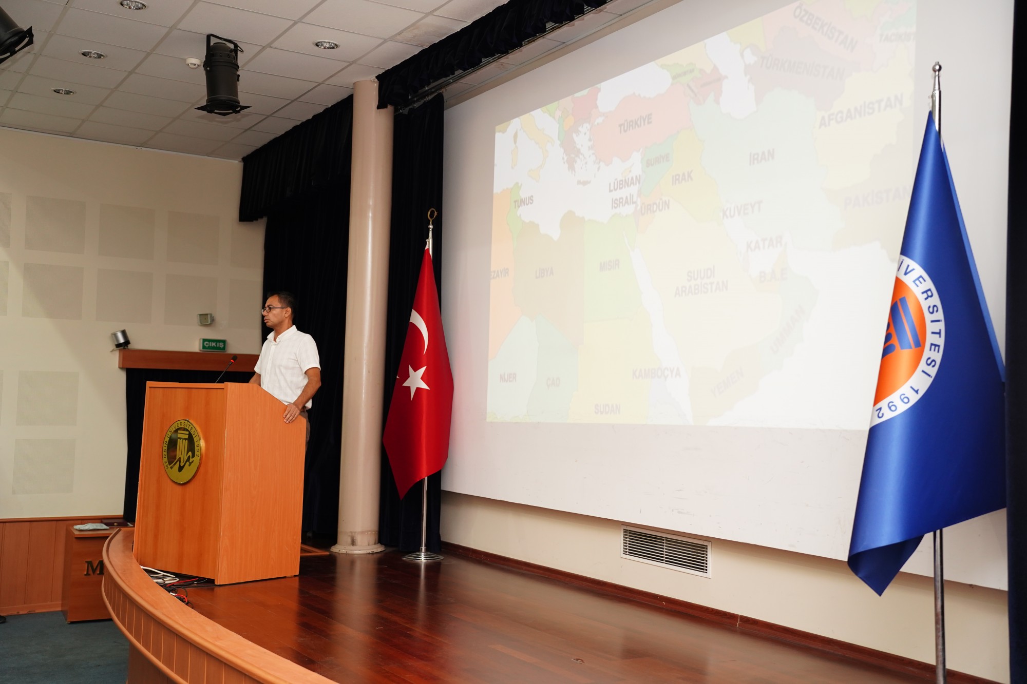 Doç. Dr. Sacit Uğuz, sunumunda Osmanlı Devleti’nden günümüze kadar devletimize zarar vermek ve içten yıkmak amacıyla yapılan planlar hakkında ayrıntılı bilgiler paylaştı. Türkiye’nin devlet yapısının çok güçlü olduğunu vurgulayan Doç. Dr. Uğuz, topraklarımızın her bir karışının savaşarak alındığını, bayrağımızın bir hikâyesi ve çok özel bir anlamı olduğunu belirtti. Çevremizdeki diğer ülkelerin aksine, sınırlarımızın ve bayrağımızın büyük devletler tarafından değil, milletimizin kararlılığıyla belirlendiğini ifade eden Doç. Dr. Uğuz, 15 Temmuz darbe girişimi gecesinde ise milletimizin büyük bir birlik ve cesaret örneği sergileyerek bu kalkışmayı bertaraf ettiğini ve tüm dünyaya gücünü gösterdiğini dile getirdi.