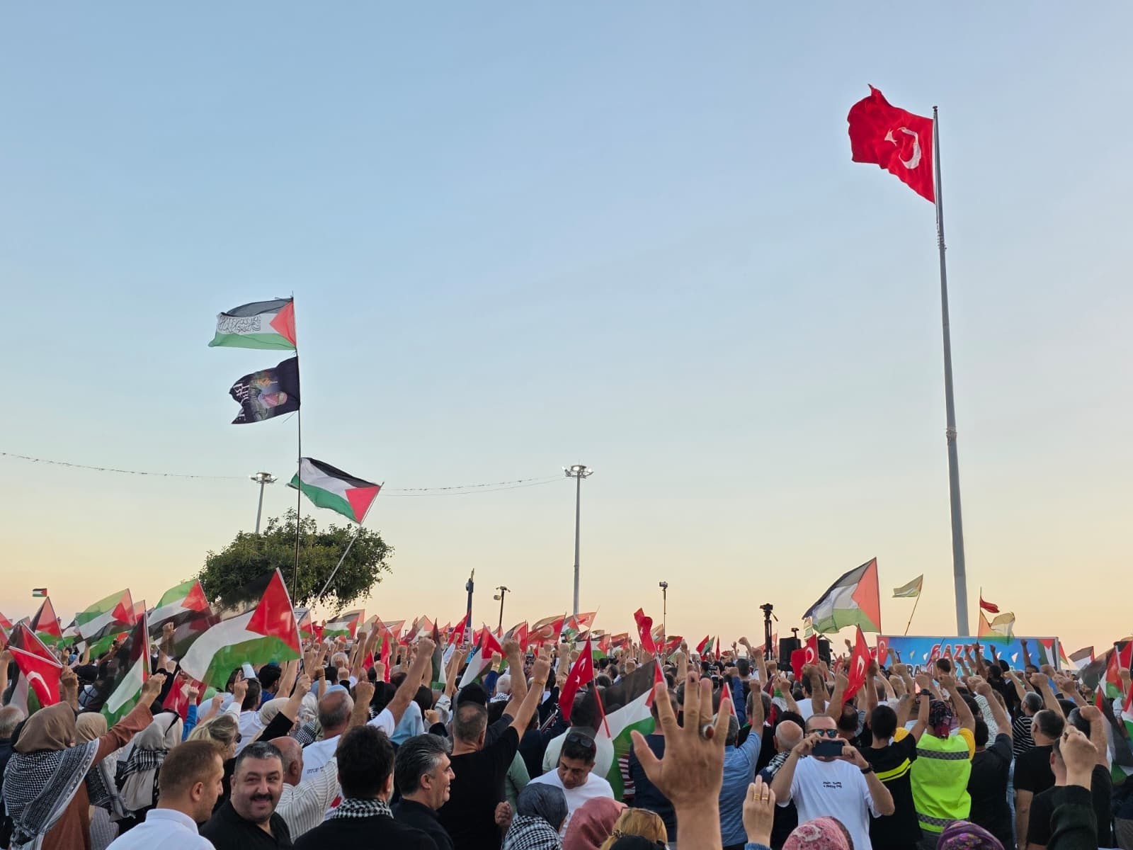 Yürüyüşte alanı dolduran binlerce katılımcı İsrail'in Gazze'de 7 Ekim 2023'ten bu yana devam eden soykırımı ve Filistin'de yaşanan insanlık dramına dikkati çekmek amacıyla sloganlar attı.