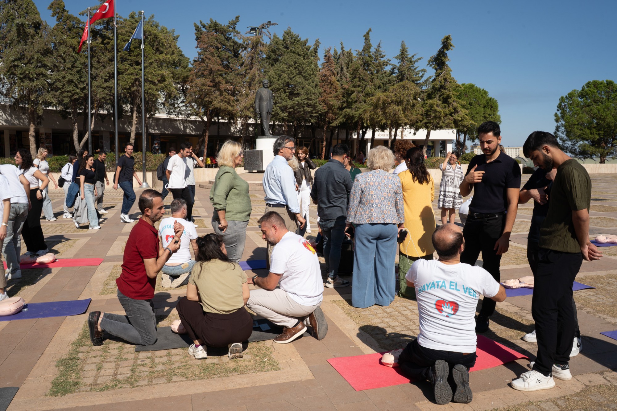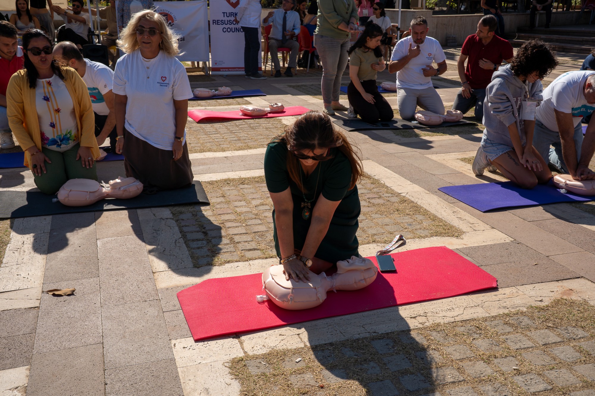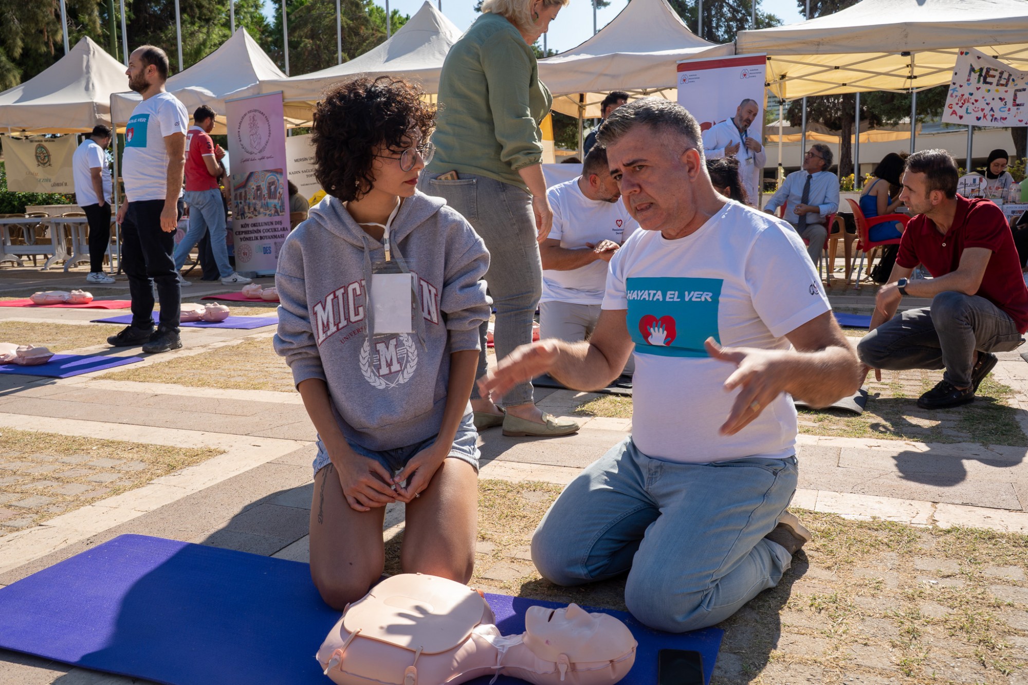 Etkinlikte, ani kalp durması durumlarında yapılması gereken Temel Yaşam Desteği (TYD) uygulamalarının toplumun geniş kesimlerine öğretilmesi ve erken müdahale bilincinin artırılması amaçlandı. Bu kapsamda, Tıp Fakültemiz Anesteziyoloji ve Reanimasyon Anabilim Dalı akademik personeli ile Resüsitasyon Derneği üyeleri tarafından gönüllü katılımcılara temel yaşam desteği uygulamaları öğretildi.